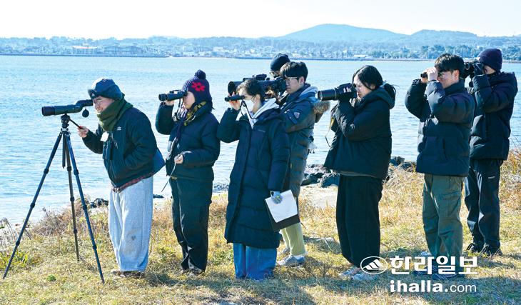[한라일보] 6일 전국대학연합야조회 회원들이 제주시 구좌읍 하도리 철새도래지와 서귀포시 성산읍 오조리 일대에서 겨울철새 개체수를 조사하고 있다. 강희만기자