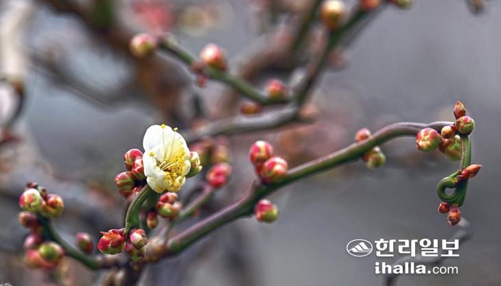 [한라일보] 7일 제주시 노형동 양석후 씨 집 정원에 매화꽃이 꽃망울을 터트려 눈길을 끌고 있다. 강희만기자