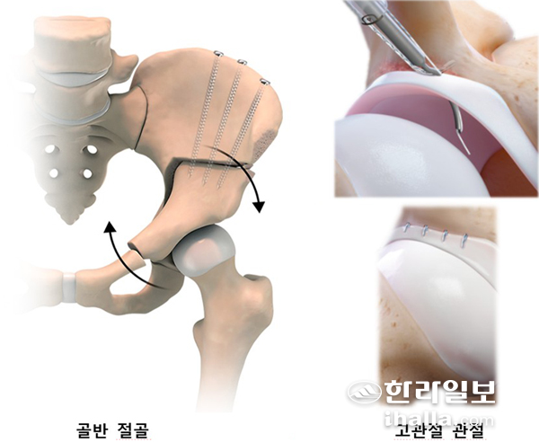 수술적 치료로는 첫째, 관절 손상이 아직 심하지 않은 젊은 환자에서 비구 주위 절골술을 고려할 수 있다. 이는 골반 뼈의 방향을 조절해 대퇴골두를 더 잘 덮이도록 만들어 관절의 안정성을 회복하는 수술로, 자신의 관절을 최대한 오래 보존하는 데 목적이 있다.