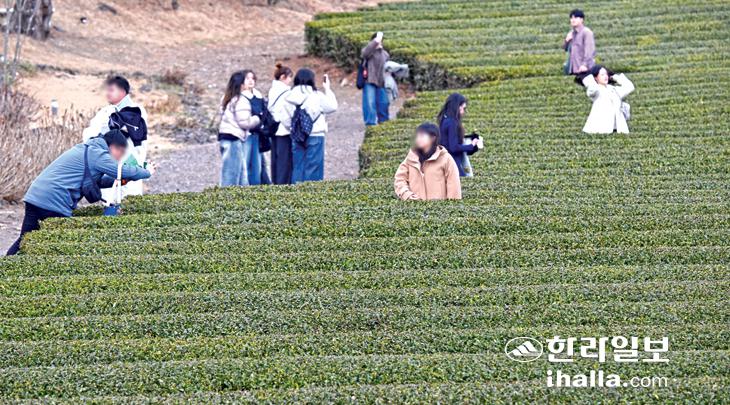 [한라일보] 8일 서귀포시 안덕면 서광리 오설록을 찾은 관광객들이 녹차밭에서 사진을 찍고 있다. 강희만기자