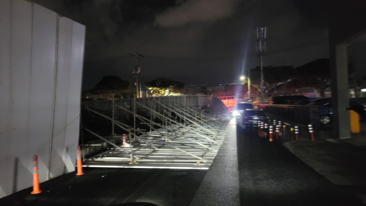 | 지난 10일 밤 10시 17분쯤 제주시 연동에서는 공사장 펜스가 쓰러져 안전조치됐다. 제주소방안전본부 제공 |