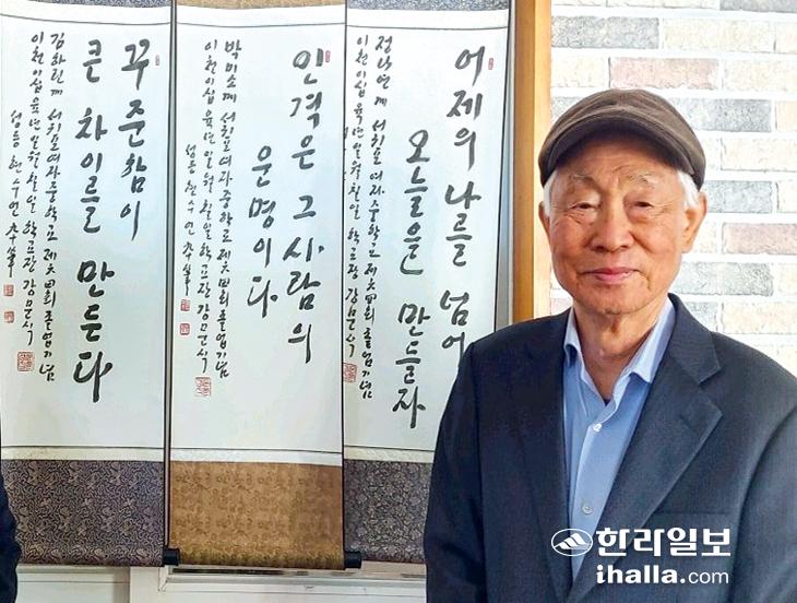 서귀포 원로 서예가인 그가 서화를 벽에 걸 수 있게 만든 족자 위에 학생들의 좌우명을 써내려 간 지도 10년이 넘어섰다. 2017년부터 지금까지 초·중등학생 1300명에게 서예로 쓴 좌우명을 졸업선물로 줬다.