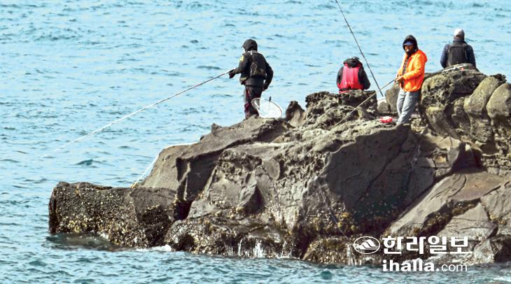 [한라일보] 10일 서귀포시 대정읍 해안에서 낚시꾼들이 강한 바람속에 대물을 기대하며 낚시를 즐기고 있다. 강희만기자