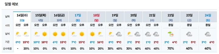 기온은 점차 올라 평년과 비슷하거나 조금 높겠다. 14일 낮 최고기온은 15℃내외, 15일 아침 최저기온도 10~13℃, 낮 최고기온은 16~18℃까지 오르며 초봄 날씨가 예상된다. 16~17일 낮 최고기온도 16℃ 내외가 되겠다.