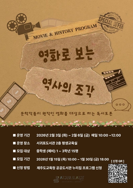 서귀포도서관 관계자는 "영화를 활용한 수업으로 역사적 배경에 대한 이해를 높이고 원작 도서 기반의 토론을 통해 청소년들이 인문학적 소양을 함양하는 계기가 되길 바란다"라고 말했다.
