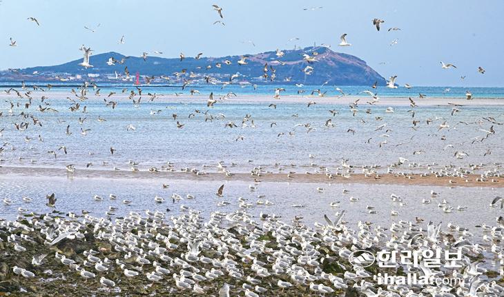 [한라일보] 15일 제주시 구좌읍 종달리 해안가를 찾은 갈매기들이 옹기종기 모여 앉아 휴식을 취하고 있다. 강희만기자