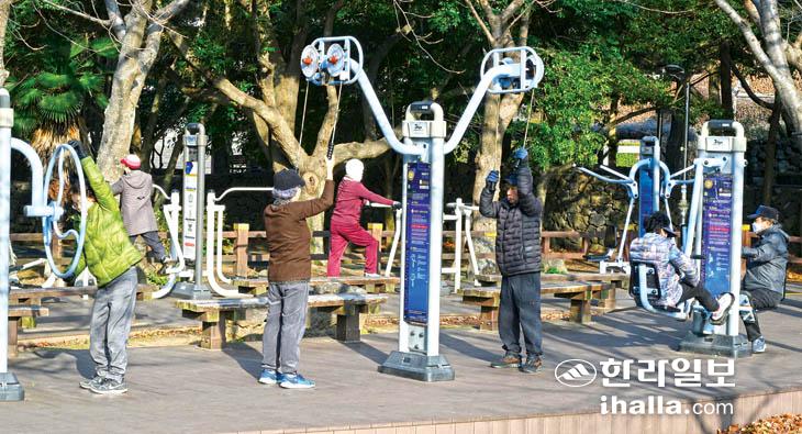 [한라일보] 온화한 날씨가 이어진 18일 제주시 신산공원을 찾은 어르신들이 운동을 하며 몸을 풀고 있다. 강희만기자