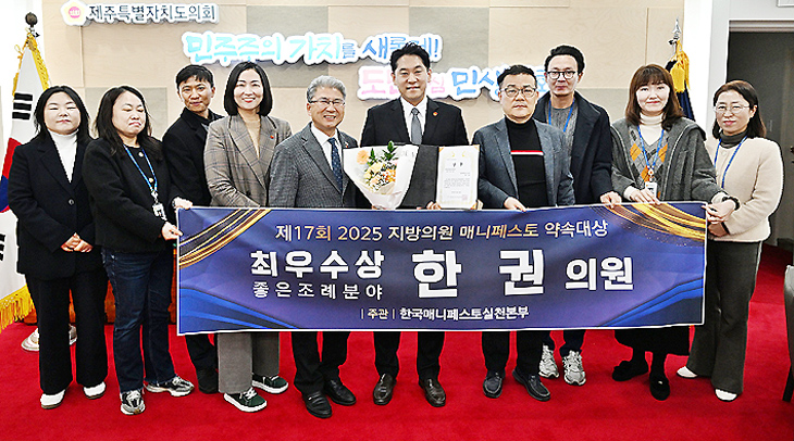 한권 제주특별자치도의회 의원(더불어민주당, 일도1·이도1·건입동)은 (사)한국매니페스토실천본부가 주관한 제17회 2025년 지방의원 매니페스토 약속대상 '좋은조례 분야'에서 최우수상을 수상했다고 19일 밝혔다.