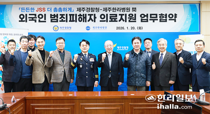 제주경찰청(청장 고평기)과 제주한라의료재단(이사장 김성수)은 20일 제주경찰청에서 건강보험 미가입 외국인 범죄피해자에 지원 업무협약을 체결했다. 이는 지난해 12월 열린 '제주보안관시스템 공동대응협의체 정기회의'에 따라 의료 사각지대를 해소하기 위해 추진됐다.