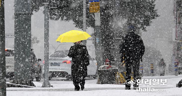 [한라일보] 한라산 일대와 중산간 지역에 대설주의보가 내려진 22일 제주시가지에도 많은 눈이 내렸다. 강희만기자