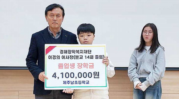 [한라일보] 경해장학복지재단(이사장 이경의)은 22일 제주남초등학교 졸업식에서 졸업생 13명에게 총 410만 원의 인재육성 장학금을 전달했다.