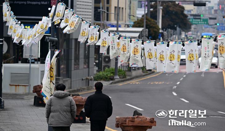 [한라일보] 1일 제주시 관덕정 인근 인도에 탐라국입춘굿을 알리는 춘등이 달려 있다. 올해 입춘굿은 오늘부터 4일까지 개최된다. 강희만기자