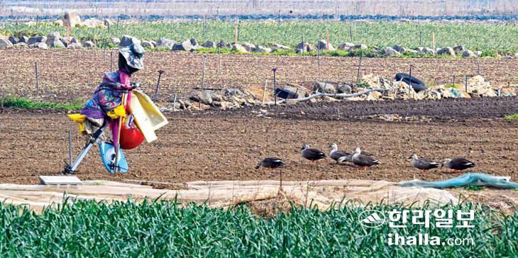 [한라일보] 11일 제주시 한경면 신창리의 한 농경지에 설치된 허수아비 앞에서 흰뺨검둥오리들이 먹이활동을 하고 있다. 강희만기자