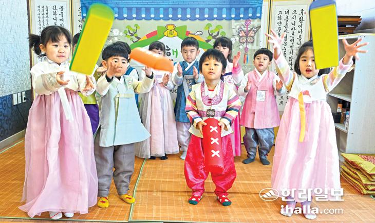 [한라일보] 윷놀이하는 어린이들 민족 고유 명절인 설을 앞둔 12일 제주시 이도동 키즈빌어린이집 원아들이 한복을 입고 윷놀이를 하며 즐거운 시간을 보내고 있다. 강희만기자
