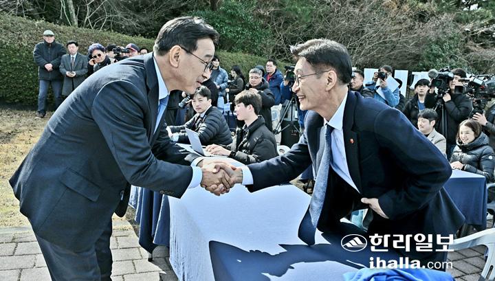 [한라일보] 19일 제주대 정문 앞에서 열린 더불어민주당 위성곤 의원의 6·3지방선거 제주자치도지사 선거 출마 선언에 앞서 당내 경쟁자인 문대림 의원과 악수하고 있다. 위 의원은 이날 회견에서 다른 후보와의 연대 가능성에 대해 "누구와도 연대가 가능하다"고 말했다.