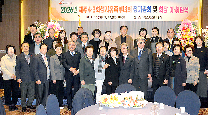 4·3희생자유족부녀회(회장 김정희)는 지난 14일 아스타호텔에서 유족회관계자 및 부녀회원 200여 명이 참석한 가운데 2026년 정기총회 및 이취임식을 개최했다.