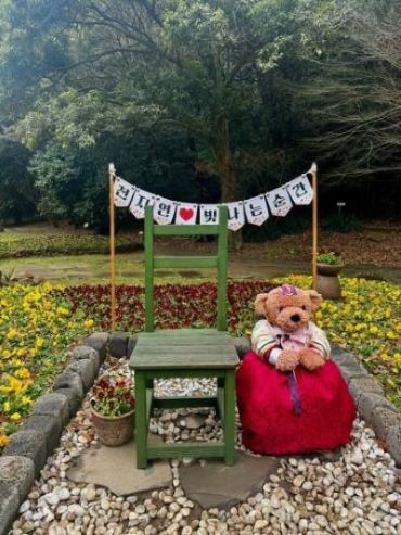 서귀포시 천지연폭포에 새롭게 단장한 한복 차림의 곰돌이 인형 '귤곰e' 포토존. 서귀포시 제공