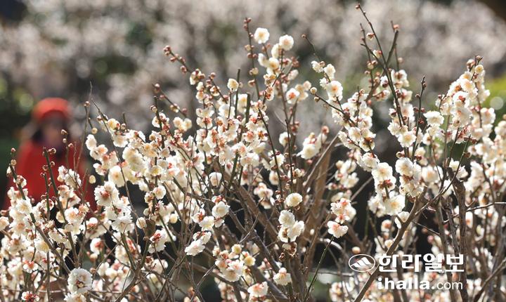 [한라일보] 23일 오전 제주 서귀포시 대정읍 노리매공원을 찾은 입장객이 활짝 핀 매화 사이에서 봄 정취를 즐기고 있다. 연합뉴스