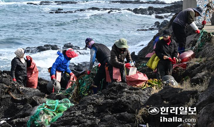 [한라일보] 4일 제주시 애월읍 고내리 해안가에서 바다환경지킴이들이 파도에 밀려온 해양쓰레기를 수거하고 있다. 강희만기자