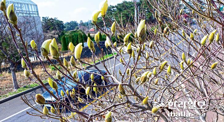 [한라일보] 4일 제주시 한림읍 도로변에 봄소식을 알리는 목련이 꽃망울을 터트려 눈길을 끌고 있다. 강희만기자