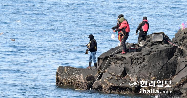[한라일보] 지난 7일 서귀포시 대정읍 동일리 해안에서 아직은 차가운 날씨 속에 대물을 기대하며 낚시를 즐기고 있다. 강희만기자