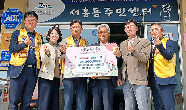 서귀포천지라이온스클럽(대표 양수웅)은 지난 12일 서귀포시 서홍동(동장 오희경)을 방문해 어려운 이웃을 돕는 데 사용해 달라며 서홍동지역사회보장협의체(공동위원장 오희경·현덕봉)에 성금 100만원을 기탁했다.