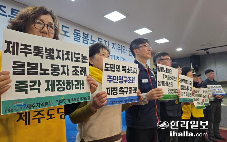 공공운수노조 제주지역본부와 정의당 제주도당은 18일 제주도의회 도민카페에서 기자회견을 열고 "1년이 지난 지금까지 도민의 목소리가 담긴 주민청구조례가 제정되지 않고 있다"며 "제주도의회는 돌봄노동자 지원조례를 즉각 제정하라"고 요구했다.