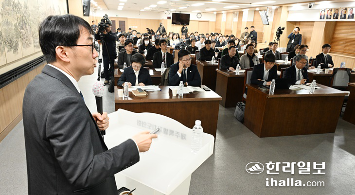 18일 제주도의회 대회의실에서 열린 제주도기자협회 주최 '상급종합병원 지정과 제주 의료의 미래: 실일과 과제를 진단한다' 토론회에서 조민우 울산대학교 의과대학 예방의학과교실 교수가 주제 발표를 하고 있다. 강희만기자
