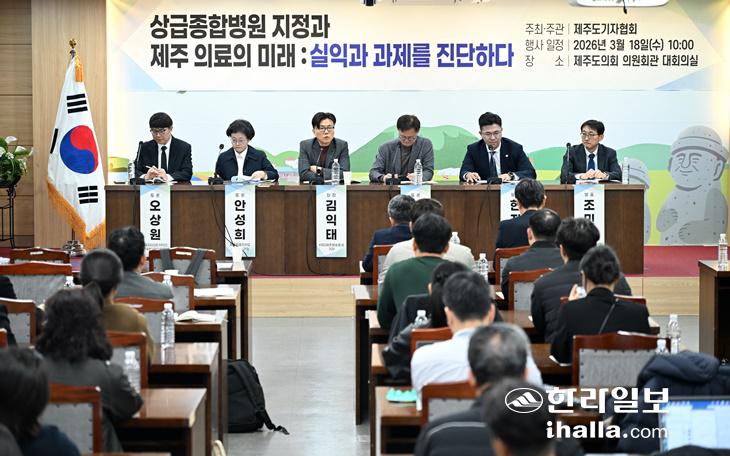 18일 제주도의회 대회의실에서 열린 제주도기자협회 주최 '상급종합병원 지정과 제주 의료의 미래: 실익과 과제를 진단한다' 토론회에서 토론자들이 발언하고 있다. 강희만기자