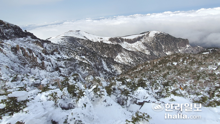 | 한라산 정상에 이르는 관음사 탐방로에서 바라본 장구목. 사진 김찬수 |