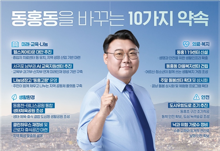 현 예비후보는 "동홍동의 변화는 더 이상 미룰 수 없는 과제"라며 "동홍동을 '살기 좋은 도시'를 넘어 '살고 싶은 도시'로 바꾸겠다"고 덧붙였다.