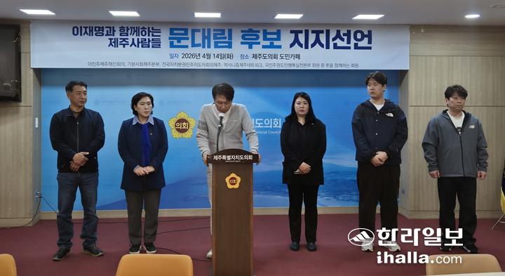 더민주혁신회의, 기본사회제주본부, 전국자치분권민주지도자회의 제주지역, 먹사니즘제주네트워크, 국민주권도민행복실천본부 소속 회원들 중 문대림 후보 지지에 동참한 회원 일동은 14일 오후 제주도의회 도민카페에서 기자회견을 열고 "이재명 정부와 가장 강한 신뢰·실행력으로 연결된 후보는 바로 문대림 후보"라고 밝혔다.