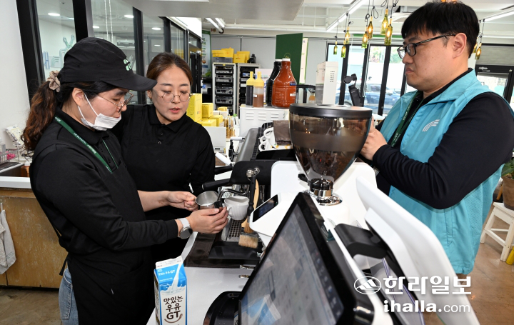 | 오민서(26, 왼쪽)씨는 카페와 베이킹을 전담한다. 오래 전부터 바리스타를 꿈꿔 온 그가 가장 자신있는 메뉴는 ‘커피’다. 반대편에선 박세원(47, 오른쪽)씨가 영상을 촬영하고 있다. 강희만기자 |