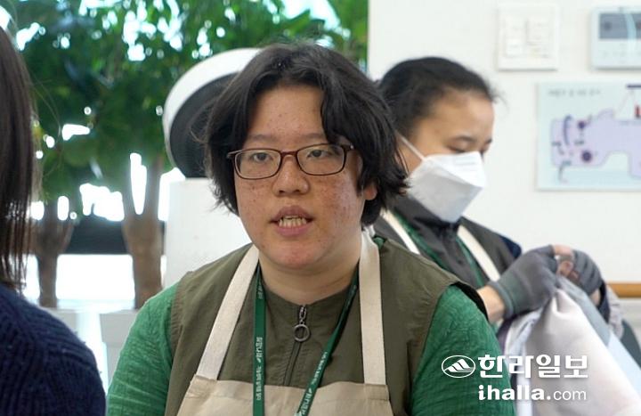 지난 14일 오전 제주시 아라동의 발달장애인 직업재활시설 희망나래꿈터. 폐현수막을 뒤집어 마대자루를 제작하던 정수연(34)씨에게 취재진이 ‘일’에 대해 묻자 이렇게 답했다.