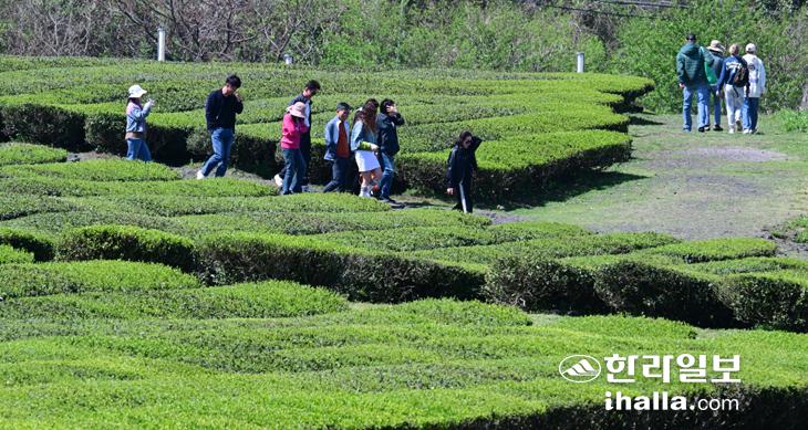 [한라일보] 완연한 봄 날씨를 보인 16일 서귀포시 안덕면 서광리 오설록을 찾은 관광객들이 녹차밭을 걷고 있다.